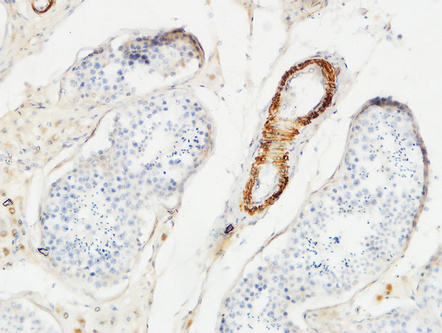 Immunohistochemical analysis of paraffin-embedded Human testis. 1, Antibody was diluted at 1:100(4° overnight). 2, High-pressure and temperature EDTA, pH8.0 was used for antigen retrieval. 3,Secondary antibody was diluted at 1:200(room temperature, 30min). |