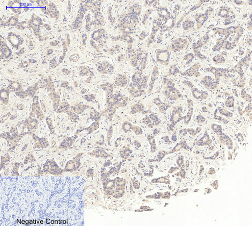 Immunohistochemical analysis of paraffin-embedded Human-colon tissue. 1,Actin β Polyclonal Antibody was diluted at 1:200(4°C,overnight). 2, Sodium citrate pH 6.0 was used for antibody retrieval(>98°C,20min). 3,Secondary antibody was diluted at 1:200(room tempeRature, 30min). Negative control was used by secondary antibody only. |