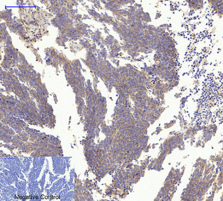 Immunohistochemical analysis of paraffin-embedded Human-uterus-cancer tissue. 1,Actin β Polyclonal Antibody was diluted at 1:200(4°C,overnight). 2, Sodium citrate pH 6.0 was used for antibody retrieval(>98°C,20min). 3,Secondary antibody was diluted at 1:200(room tempeRature, 30min). Negative control was used by secondary antibody only. |