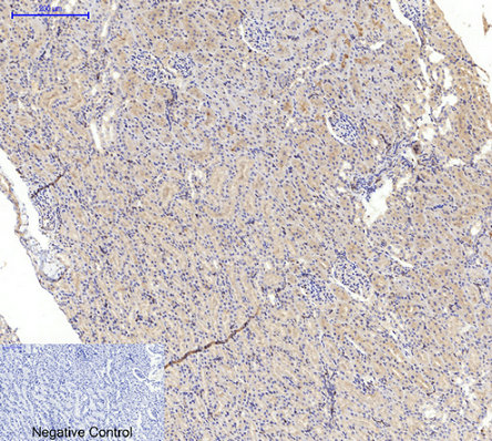 Immunohistochemical analysis of paraffin-embedded Rat-kidney tissue. 1,Actin β Polyclonal Antibody was diluted at 1:200(4°C,overnight). 2, Sodium citrate pH 6.0 was used for antibody retrieval(>98°C,20min). 3,Secondary antibody was diluted at 1:200(room tempeRature, 30min). Negative control was used by secondary antibody only. |