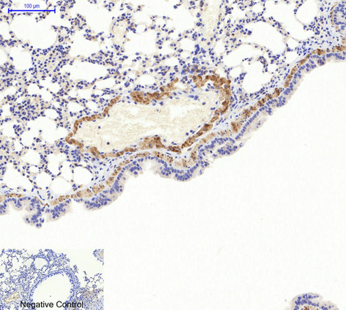 Immunohistochemical analysis of paraffin-embedded Mouse-lung tissue. 1,Actin β Polyclonal Antibody was diluted at 1:200(4°C,overnight). 2, Sodium citrate pH 6.0 was used for antibody retrieval(>98°C,20min). 3,Secondary antibody was diluted at 1:200(room tempeRature, 30min). Negative control was used by secondary antibody only. |