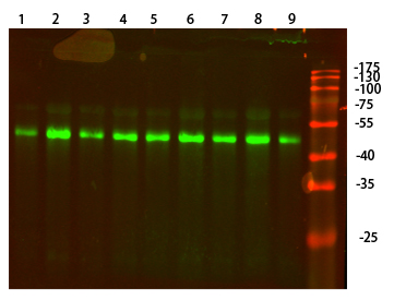 Western Blot analysis of 1,hela 2,A549 3,HEPG2 4,Mouse-brain 5,Mouse-lung 6,Mouse-liver 7,Rat-brain 8,Rat-lung 9,Rat-liver cells using primary antibody diluted at 1:1000(4°C overnight). Secondary antibody:Goat Anti-rabbit IgG IRDye 800( diluted at 1:5000, 25°C, 1 hour). Cell lysate was extracted by Minute™ Plasma Membrane Protein Isolation and Cell Fractionation Kit. |