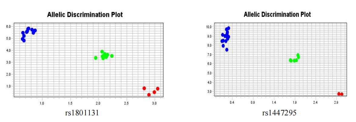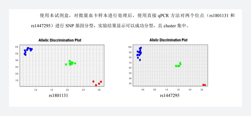 使用本试剂盒,对批量血卡样本进行处理后,使用直接 qPCR 方法对两个位点(rs1801131 和 rs1447295)进行 SNP 基因分型,实验结果显示可以成功分型,且 cluster 集中。