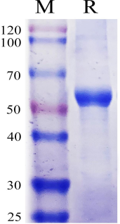 Recombinant SARS-CoV-2 RBD mFc tag, His tag, on SDS-PAGE under reducing (R) condition. The gel was stained overnight with Coomassie Blue. The purity of the protein is greater than 95%.