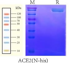Human Recombinant SARS-CoV-2 ACE2 Protein, on SDS-PAGE under reducing (R) condition. The gel was stained overnight with Coomassie Blue. The purity of the protein is greater than 95%