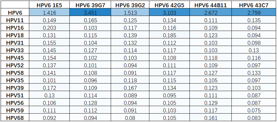 • Application 用于HPV 6-L1 蛋白的ELISA,筛选合适单抗以建立VLP 疫苗体外比活或含量测定方法
