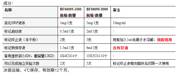 Special Notes: 1. The labeling stop solution component in this kit is lyophilized powder, which must be ready for use, and the number of independent packaging of the labeling stop solution determines the number of experiments that the kit can be used independently. 2. This kit has a 1000μg specification product, which can independently complete 2 experiments (including 2 labeling stops). 3. This kit of 5000μg specification product can independently complete 5 experiments (including 5 labeling termination solutions). HRP Labeling Kit HRP Labeling Kit Recommended labeling ratio: (Antibody:HRP labeling mass ratio is 1:1; Antigen: HRP mass ratio is about 1:1 ~ 1:4) Disclaimer: The data here is for reference only, and customers can adjust the scale according to the marking effect;